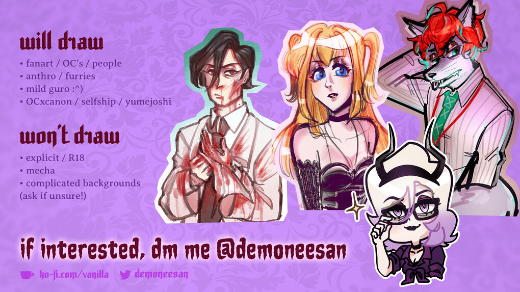 0. Please read the full terms of service before proceeding1. DM me on twitter @demoneesan OR fill in the commission form on ko-fi. Wait for me to contact you back (via twitter dm or email) to confirm your commission. Please allow up to one week for my response.2. Payment can be made via ko-fi donation. After the full payment has been completed, only then I will start on your commission.4. Please allow up to 2-5 weeks for your commission to be finished, depending on complexity. I do not do rush commissions.5. I will show at least one (1) screenshot WIP of your commission, starting with the sketch stage. I will be checking with you to see if you approve of it or any changes have to be made.You will have at least three (3) times to request revisions.After that, I will proceed accordingly up until it is complete.🟣 General stages of commissioned art: